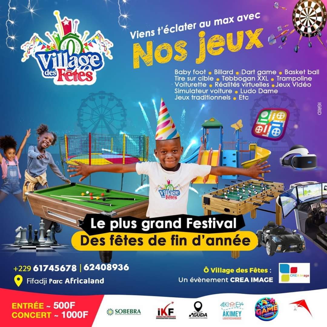 Du 21 décembre 2023 au 1er janvier 2024, vivez avec l’agence CREA IMAGE, ce grand évènement qui se tient en plein cœur de Cotonou. Moment de divertissement et de distraction de toute la famille, le festival ‘’O village des fêtes’’ offre un espace ludique pour les enfants, les parents et toute la famille pour la fête de Noël et de la Saint Sylvestre. Le Marché de Noël qui ouvre ses portes dans le parc à partir du 21 décembre procure à tous ses visiteurs la joie et la satisfaction. Tous les articles de Noël comme les jouets, les vêtements, les chaussures, les variétés de jus de fruits, et bien d’autres encore sont rangés dans des stands par des exposants, à des prix imbattables sur le festival O Village des fêtes.