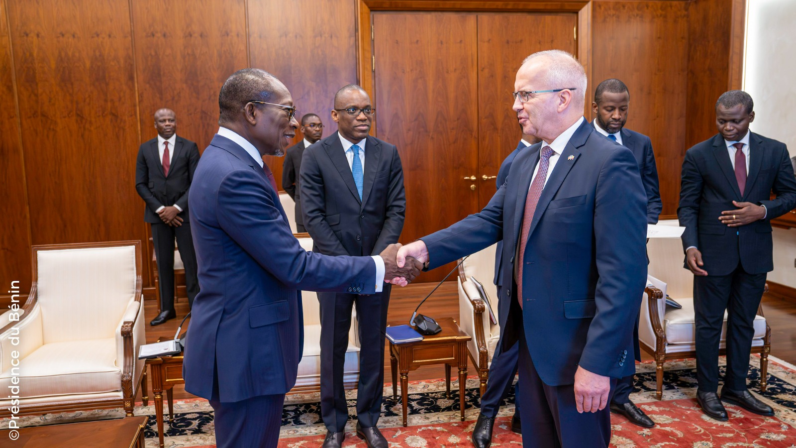 Le président de la République Patrice Talon a reçu dans la matinée d’hier jeudi 29 février 2024, les lettres de créance de neuf (9) nouveaux Ambassadeurs accrédités au Bénin par leurs pays respectifs. C’était au cours d’une cérémonie fort simple en présence de membres du gouvernement. Il s’agit de leurs Excellences les Ambassadeurs Ricardo GARCIA NAPOLES du Cuba, Stefan BUCHWALD de la République fédérale d’Allemagne, Joris W. P. JURRIËNS du Royaume des Pays-Bas, Ragaa ELWAKEEL de la République arabe d’Egypte, Maxwell RANGA de la République du Zimbabwe, Mohamadou MUSA NJIE de la Gambie, Juan Alfredo MIRANDA ORTIZ de la République du Mexique, José BAMOQUINA ZAU d’Angola et David KABRE du Burkina Faso.