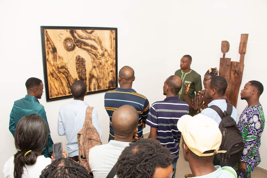 Les peintures et sculptures actuellement en exposition explorent les vertus de la femme, ses épopées et rôles au sein de la société africaine. Agbégnigan ALIHONOU, singulièrement, fait ressortir dans ses créations la beauté, la dévotion, la complémentarité, les sacrifices, les douleurs silencieuses ou apparentes et le pouvoir de la femme. Il utilise la technique du Zota ou rehauts de feu, de la gravure de feu sur bois et du collage. Ses sculptures sont faites de bois massifs, à l’instar de celles de son compatriote Assion TEKO qui se fait remarquer dans cette exposition par ses sculptures majestueuses. Il aborde des notions relatives aux tâches ménagères, à l’éducation, à la bienveillance et la combativité, toutes, faisant partie du quotidien de la femme.